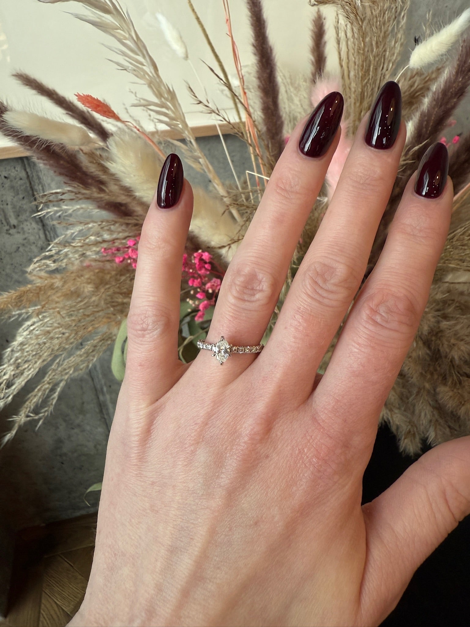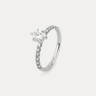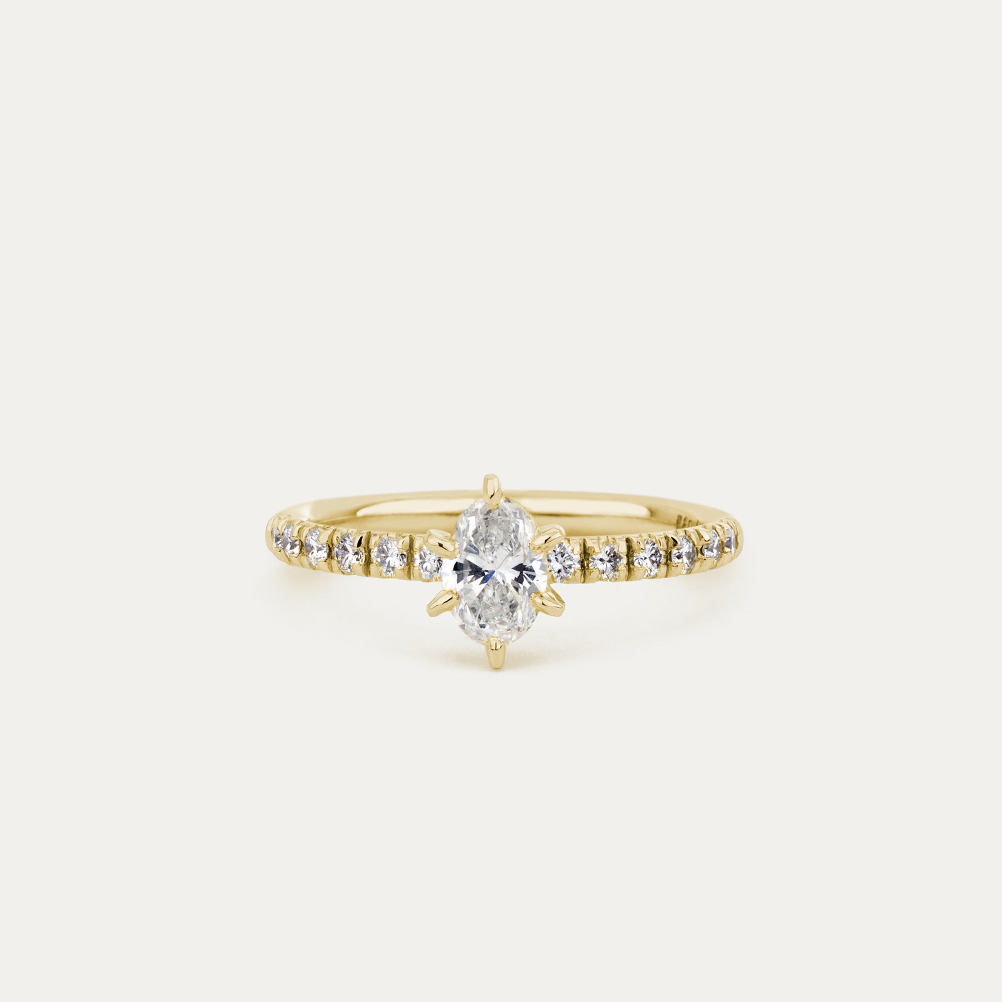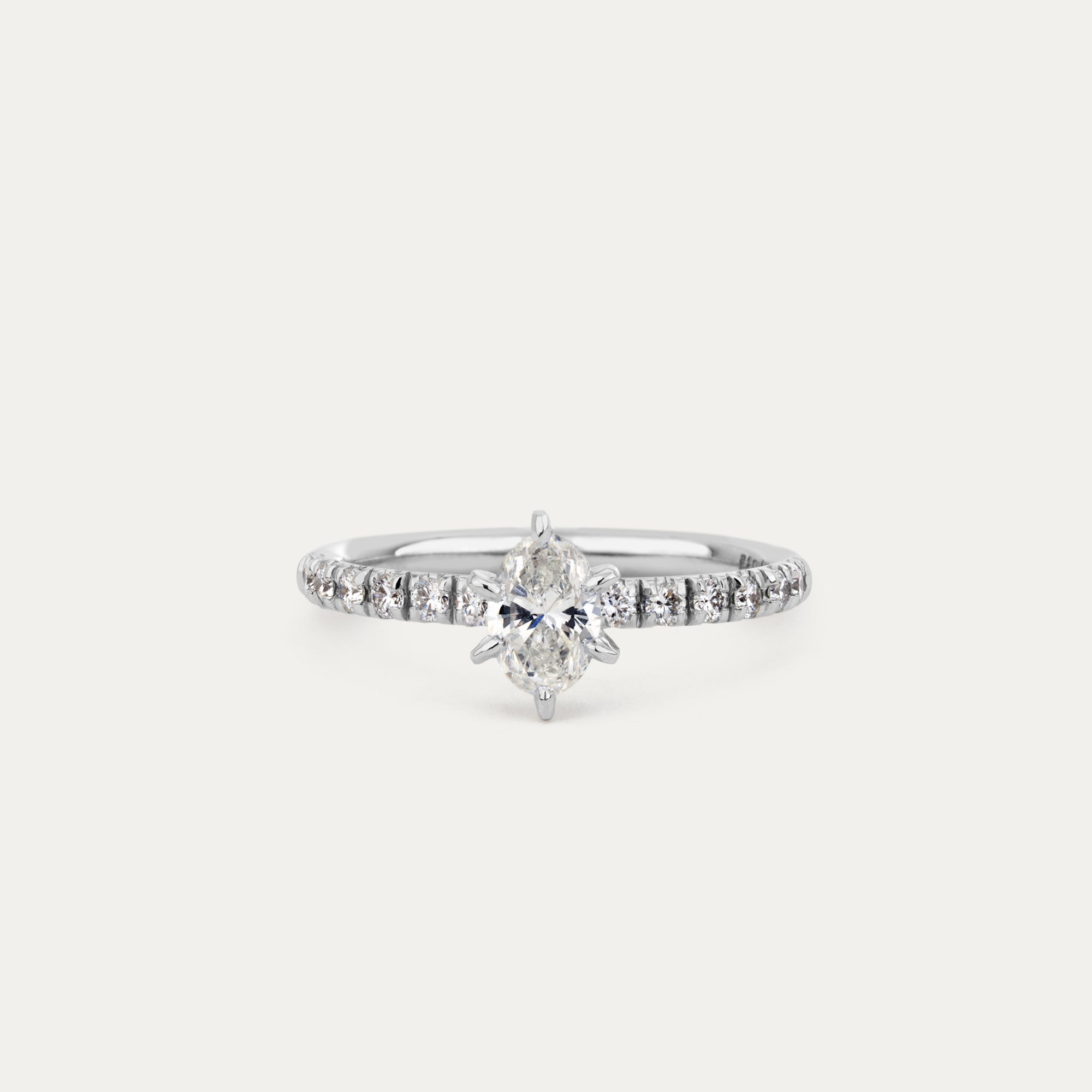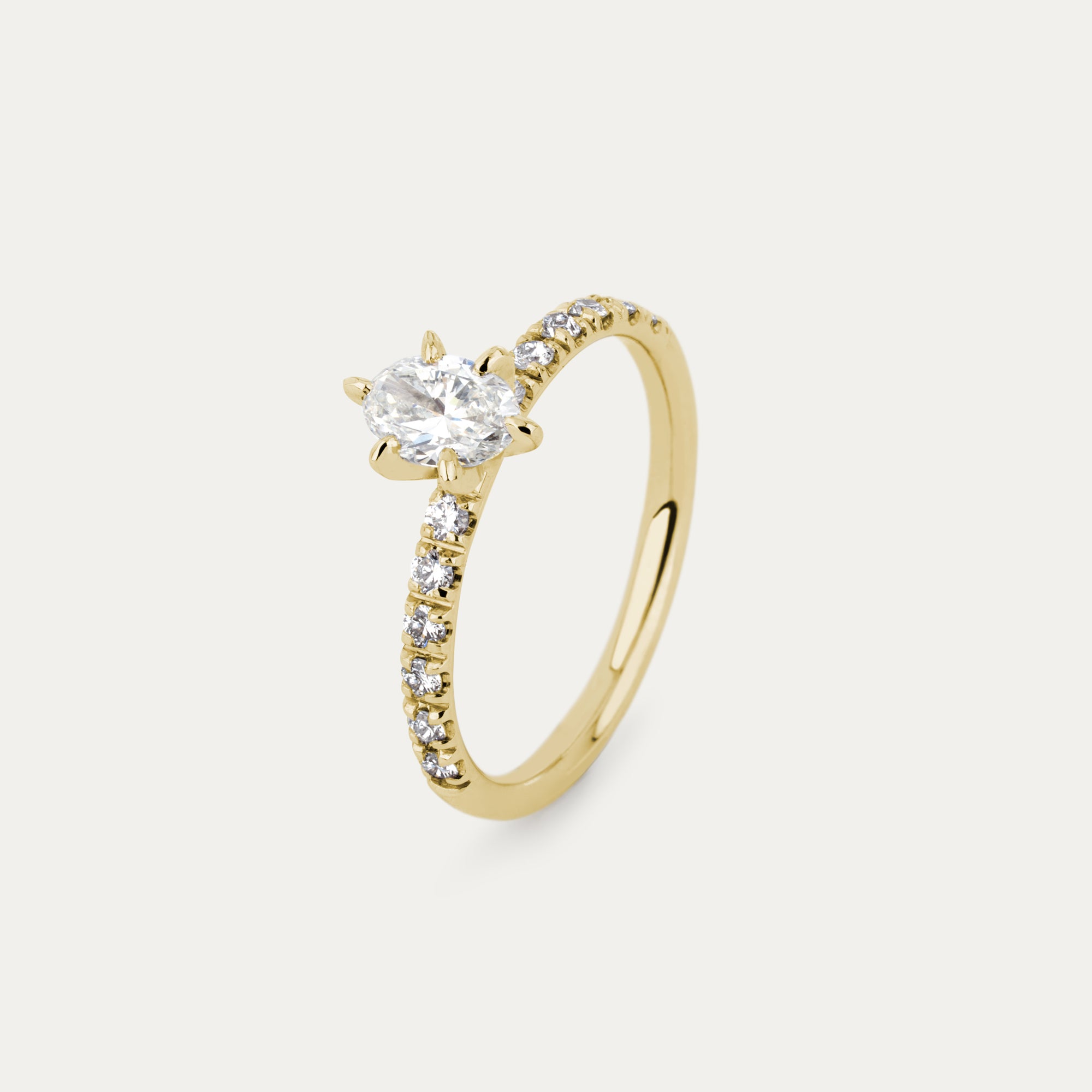 Fallegur solitaire demantshringur með Oval Cut GIA vottuðum demanti og minni demöntum í baug.