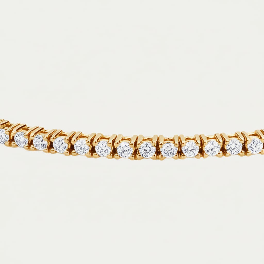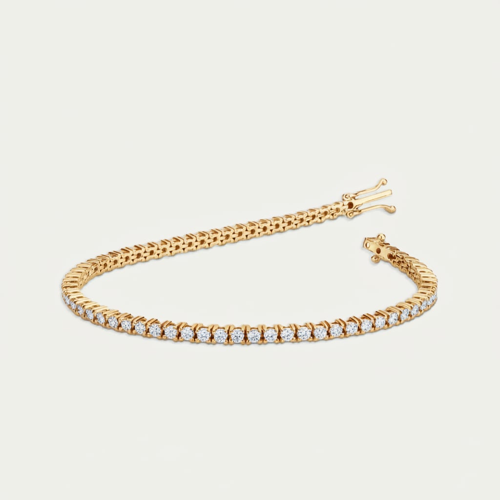 Tennisarmbandið er sveigjanlegt með mörgum jafnstórum demöntum sem festir eru í gullklær og mynda línulegt sígilt armbandið sem þægilegt er að bera.
