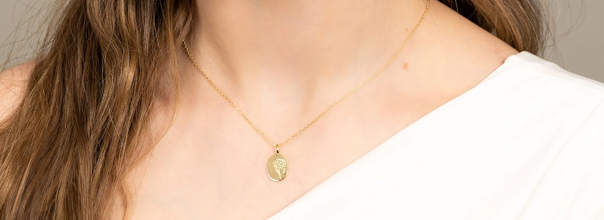 Fínleg hálsmen með einkennisblómi hvers mánaðar grafið sem mynd framan á sporöskjulagað men og mánaðarheiti aftan á. Menin eru úr 925 sterling silfri, sem fæst með 18kt gyllingu eða rhodium. Einstaklega falleg og skemmtileg gjöf fyrir alla aldurshópa.