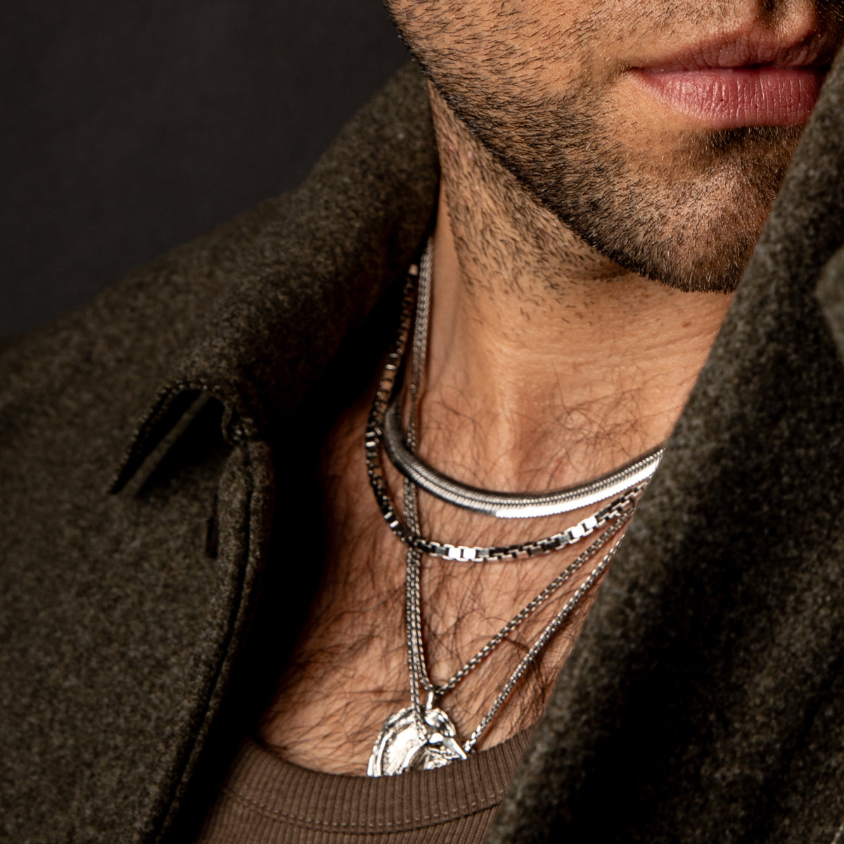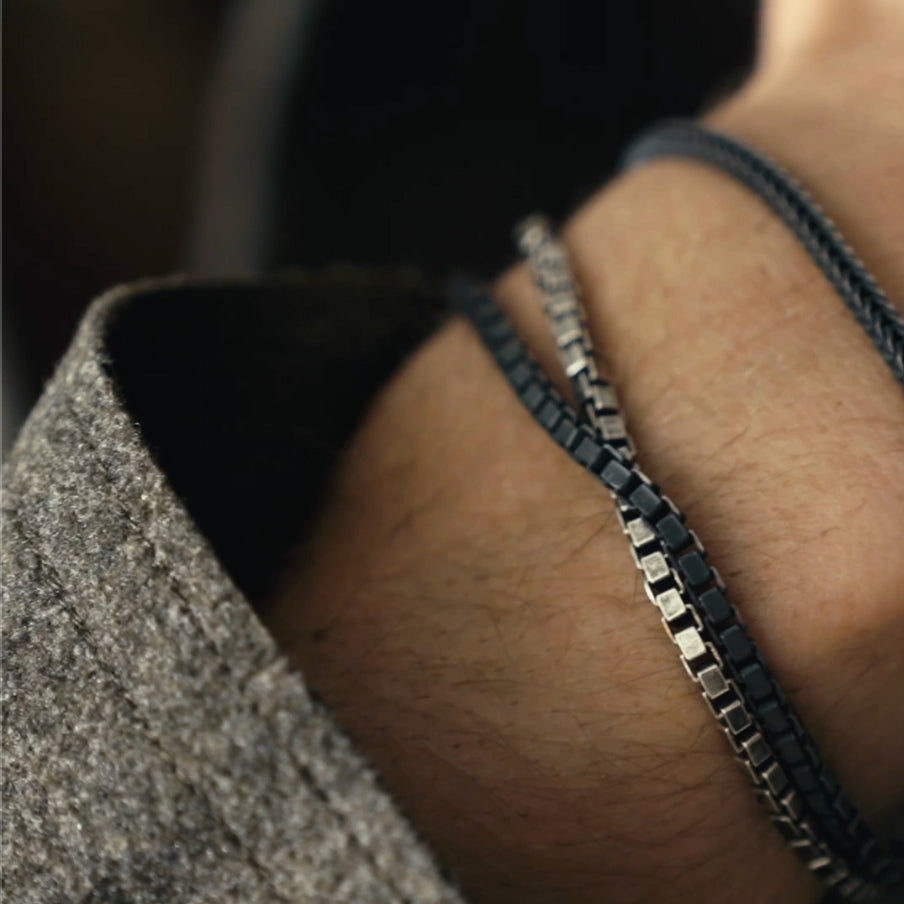 In our opinion, a bracelet is the perfect gift for men and they often arrange 2-3 together on the same hand. There is a wide selection of different chains available, both rhodium/shiny & with an oxide or matte black finish.